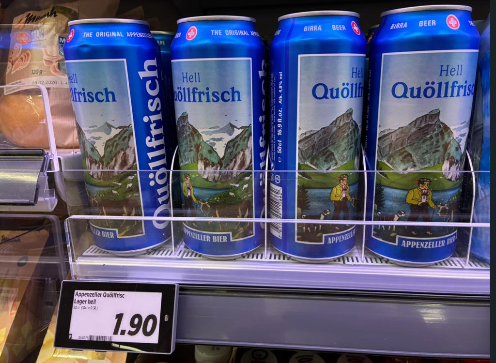 ちなみに、ここでビールを注文すると6.5CHF(1,300円相当)ですが、スーパーで買うと1.9CHF(380円相当)とだいぶ安くなります。Quöllfrisch(クエルフリッシュ)。スイスのビールで軽くて飲みやすい。今日はこれを頂きます。