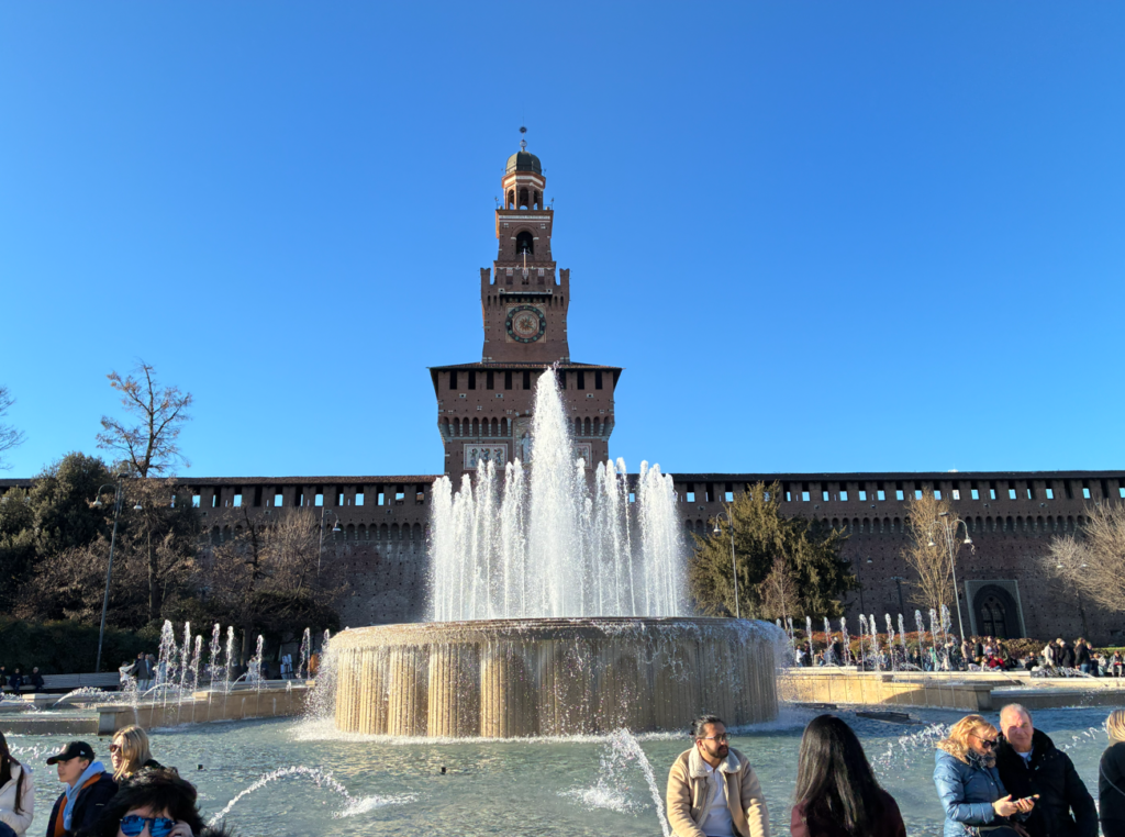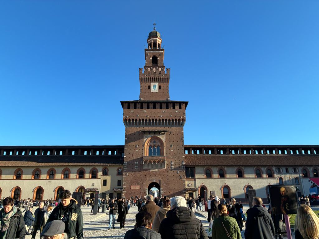 スフォルツェスコ城(Castello Sforzesco)。巨大な赤レンガの城というより要塞っぽく見えます。