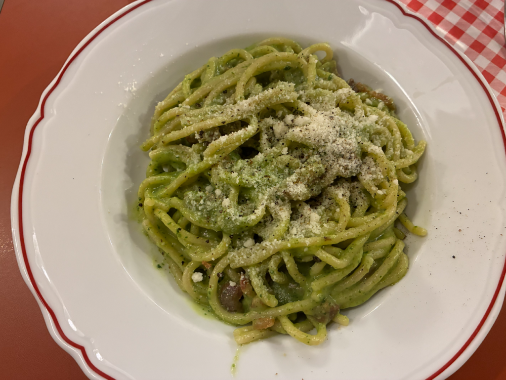 イタリアと言えばパスタ。Broccolone(ブロッコリーペスト × グアンチャーレ)。ジェノベーゼのように見えるが、バジルではなくブロッコリー。重そうに見えて、実際はかなり軽くビールとマッチ。