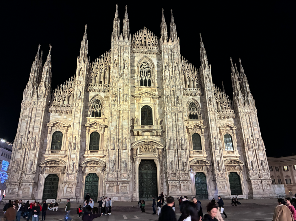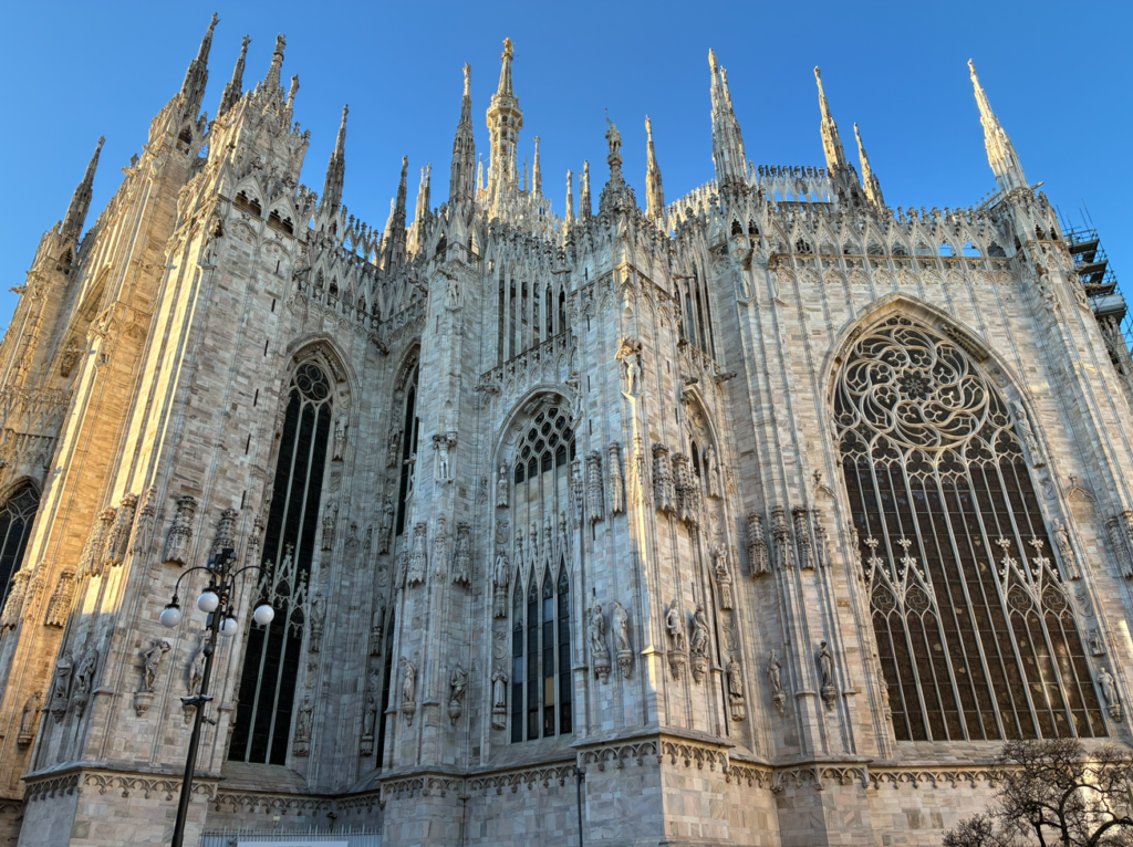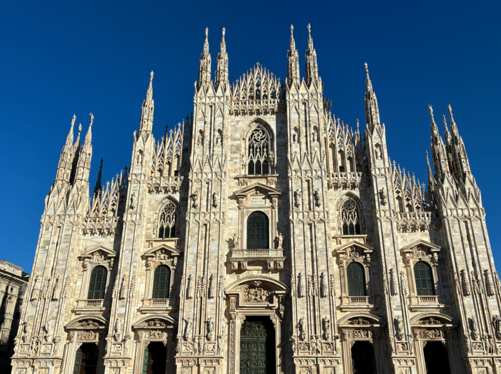 真正面から見ると圧巻。ミラノの中心に立つ巨大なゴシック大聖堂。イタリア最大・世界でもトップクラスの規模を誇る教会で、なんと、中世から現代まで作り続けていた「完成に600年かかった教会」。世代を超えた国家プロジェクトとか。。。何世代を超えてんねん!っと、つっこみたくなる年月。