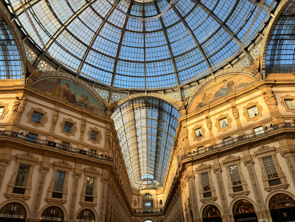 ここはヨーロッパで最も地価が高い商業空間の一つとかで、Prada、Louis Vuitton、Gucciなどの高級ブランドがズラリと並んでます。そして、ガラスと鉄骨の巨大ドーム屋根が大きな特徴。