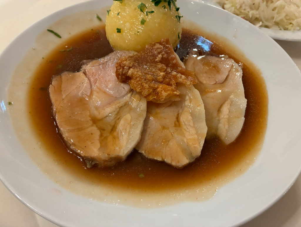 スタッフ曰く王道バイエルン料理らしいOfenfrischer Krusten-Jung-Schweinebraten。皮パリのローストポーク+クネーデル(団子)。これは美味い!トルコ料理が特に美味いと思いましたが、これはトルコ料理と良い勝負するレベル。ビールとの相性が抜群。