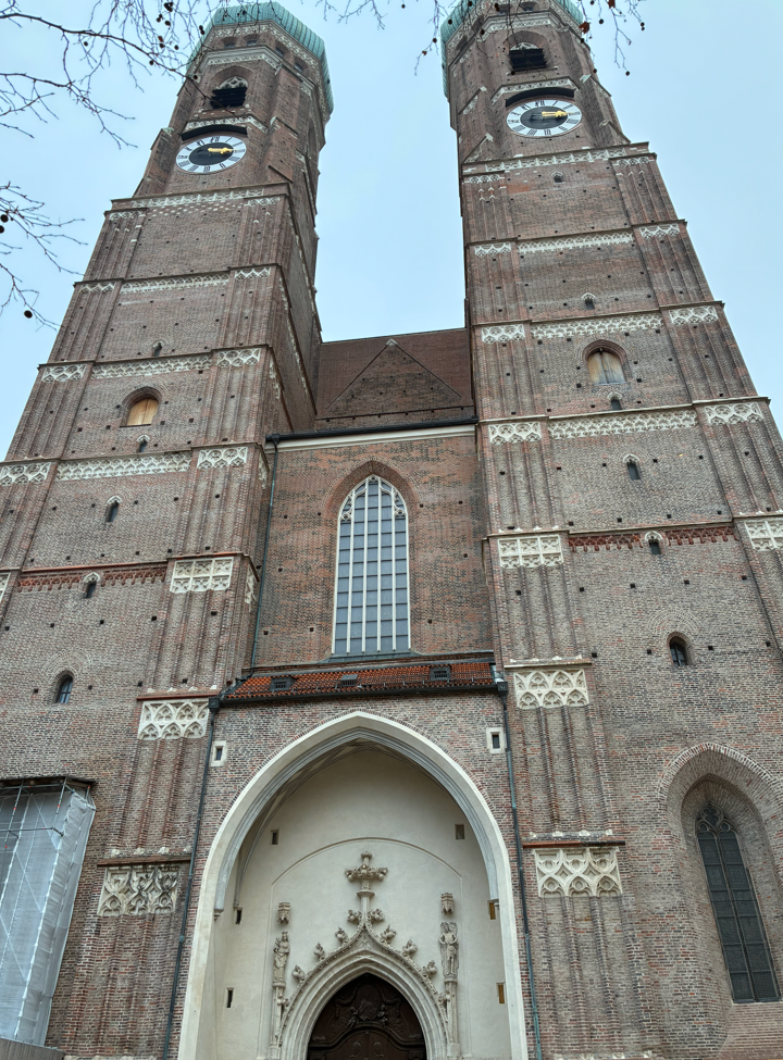 遠くからでも目立つ双子の塔(玉ねぎ型ドーム)のフラウエン教会(Frauenkirche)。ミュンヘンでいちばん有名な教会&街の象徴。
