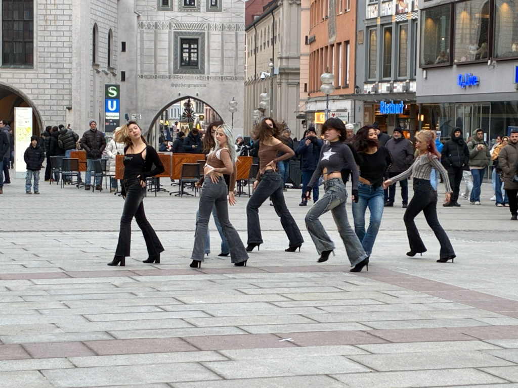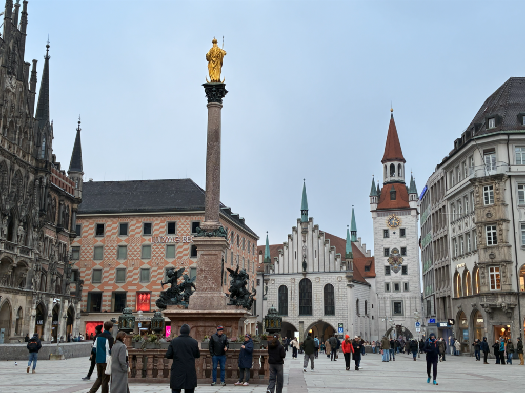 続いて、ミュンヘン観光のど真ん中マリエン広場(Marienplatz)。観光・待ち合わせ・イベントの中心。渋谷のハチ公的な場所でしょうか。モニュメントやドイツっぽい建物に囲まれています。