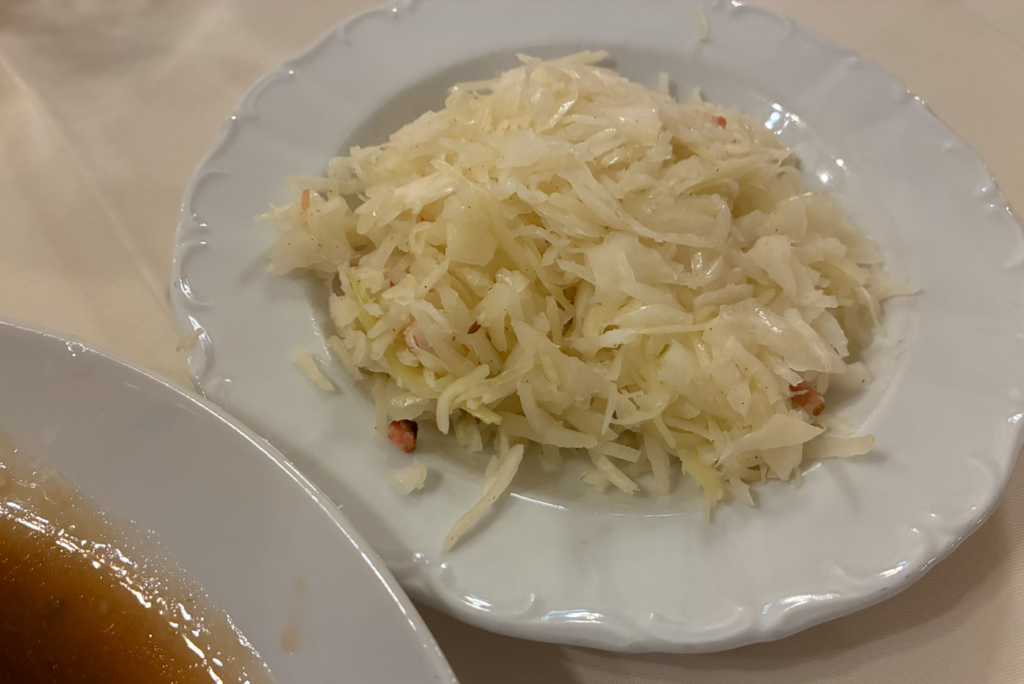 Krautsalat。 別皿の白い千切りキャベツ(酢&油、ベーコン少々)。何だろと思って食べると千切りキャベツ。酢がきいてて口直しにグッド。