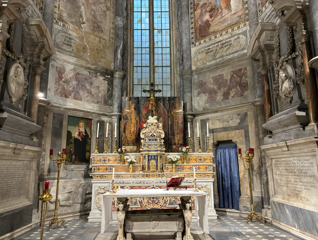 面白いのがサンタ・レスティトゥータ聖堂(Santa Restituta)。ナポリ大聖堂の中にある最古の教会部分(4〜5世紀起源)。“教会の中にさらに古い教会がある”感じ。