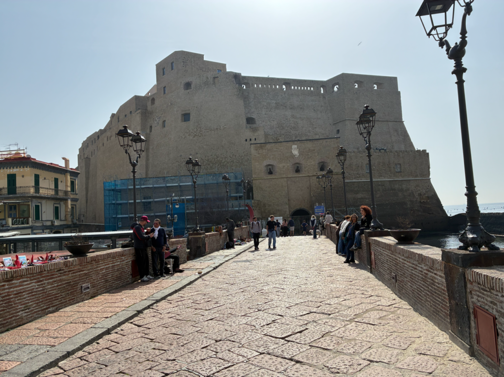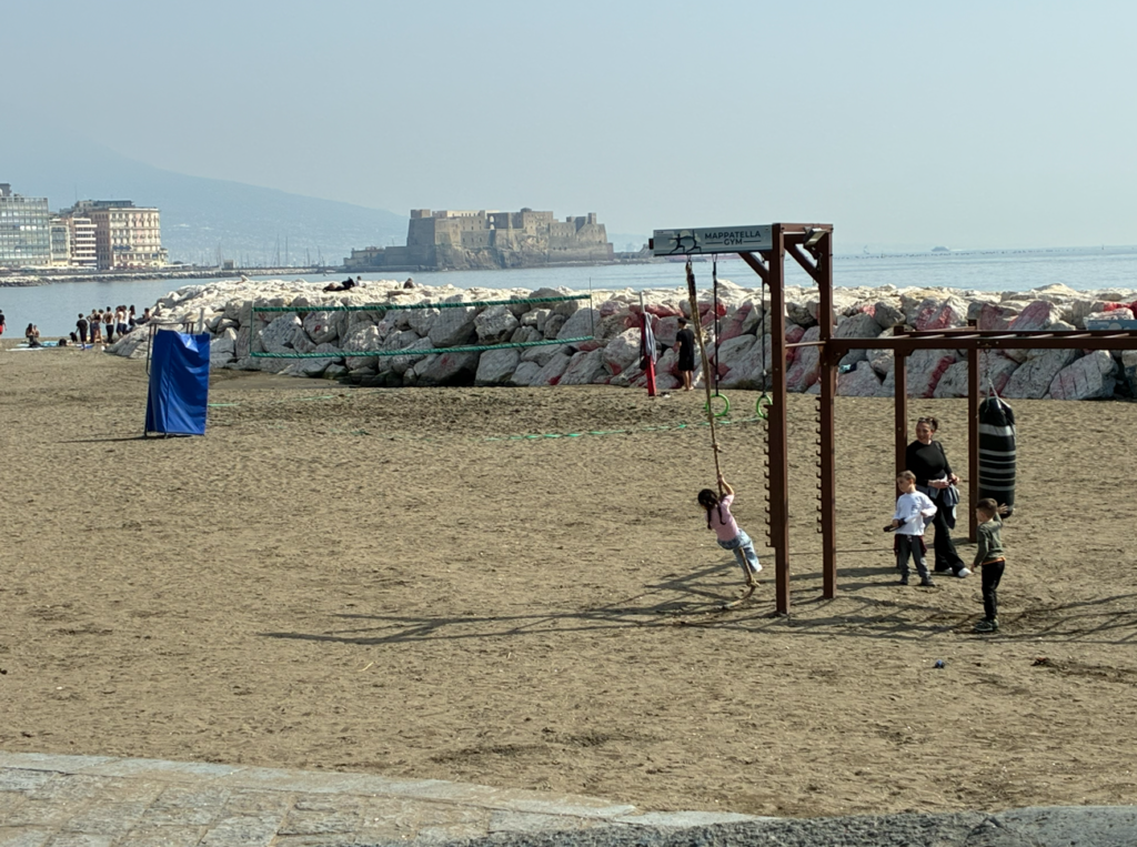 砂浜では子供たちが遊んでおり、流石に海で泳いでいる人はいませんが、水着の若者たちもいます。そして、遠くに見えているのが海に浮かぶ城の卵城(Castel dell’Ovo)。無料で入れて見晴らしが良いらしいので行ってみます。