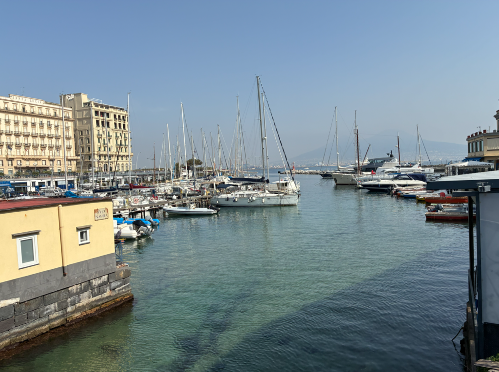 海は綺麗だしヨットハーバーもイイ感じ。遠くに薄っすら見えている山はポンペイを大噴火で襲ったヴェスヴィオ山。上手く行かない日ですが、綺麗な景色に癒されて良しとしましょう。