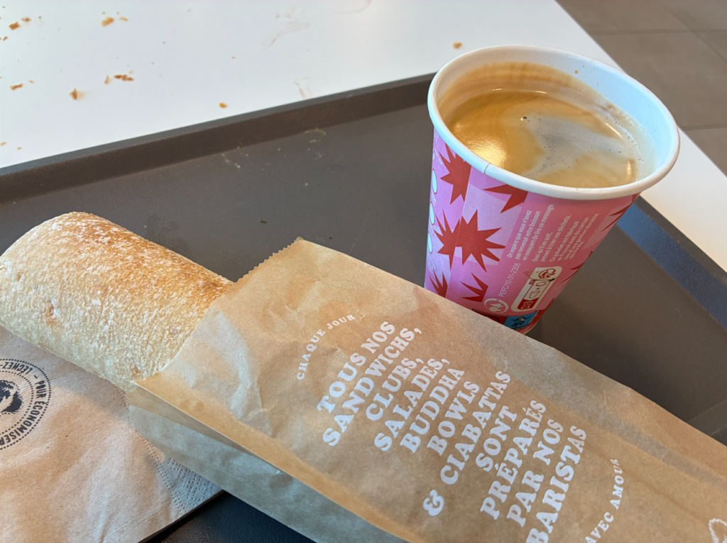 そしてまさかの日本人だらけツアーにびっくり。大学生くらいの人達がたくさん。時期的に卒業旅行でしょうか。いいなぁ。私の大学生時代は金銭的にフランスなんてとても無理でタイへの格安(5万円)卒業旅行でした(笑)。途中の休憩所で朝食。サンドイッチ&コーヒーで10.1€(1800円相当)。うーん、高い。