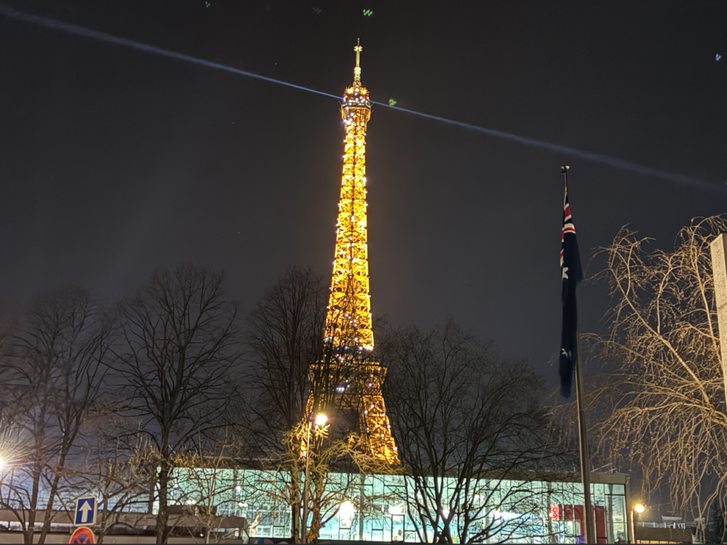 帰り道もシャトルバスを利用せずに歩きます。パリ往復のバス10時間、観光4時間ですが歩数は1.8万歩。パリに戻ると21時でした。早朝と異なり、この時間のエッフェル塔はピカピカでとてもキレイです。