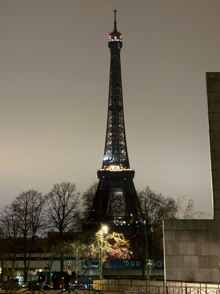 集合場所はエッフェル塔の近く、朝6時半のエッフェル塔は、ライトアップも弱く寂しい感じ。