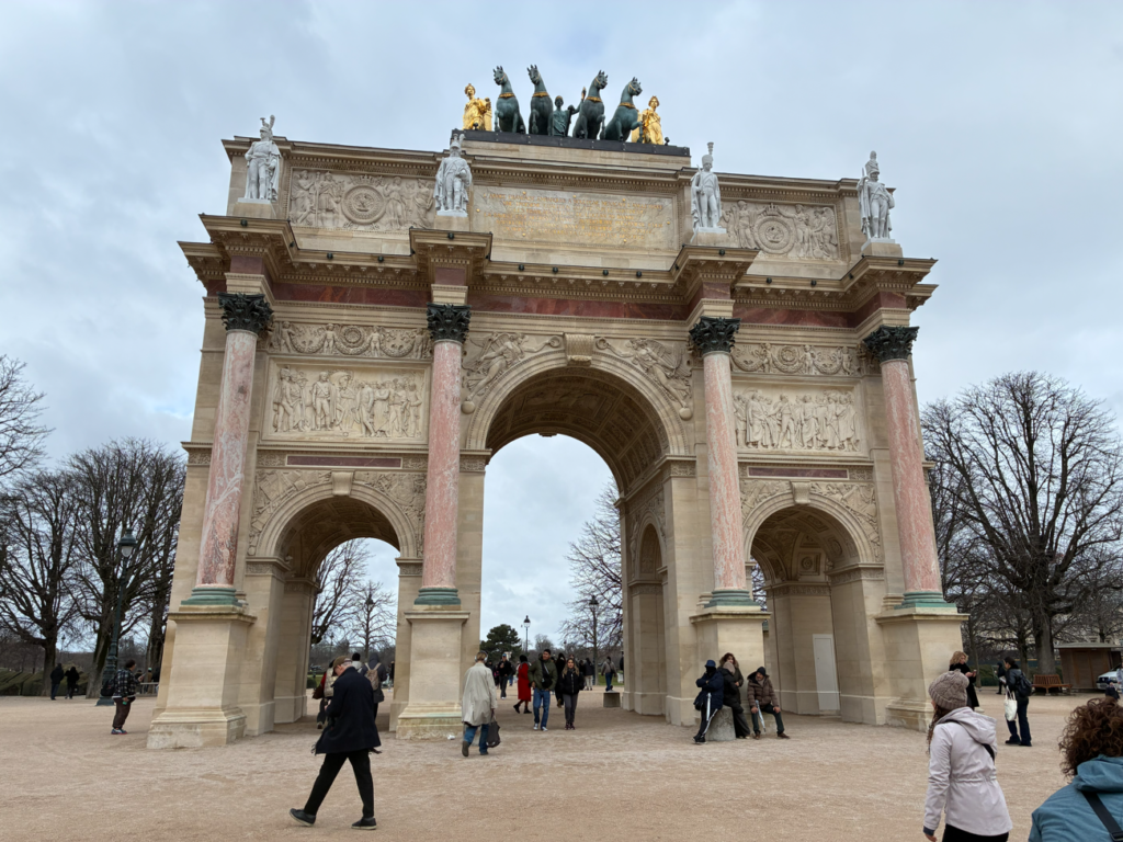 そしてカルーゼル凱旋門(Arc de Triomphe du Carrousel)。これは戦争勝利記念ではなく、ナポレオンの宮殿用の“正門”だったとか。今日はここから、本物の凱旋門であるエトワール凱旋門(Arc de Triomphe)まで歩く予定です。