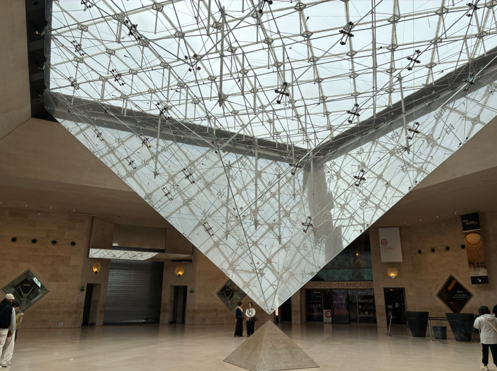 見学を終えて外に出るとクール・ナポレオン(Cour Napoléon)と呼ばれる中央広場。地下鉄で来て、地下から美術館に入ったので外観を見るのはこれがお初。真ん中のガラスの三角は、さっき地下で見た逆さピラミッドの地上部分。通称、ルーブル・ピラミッド。