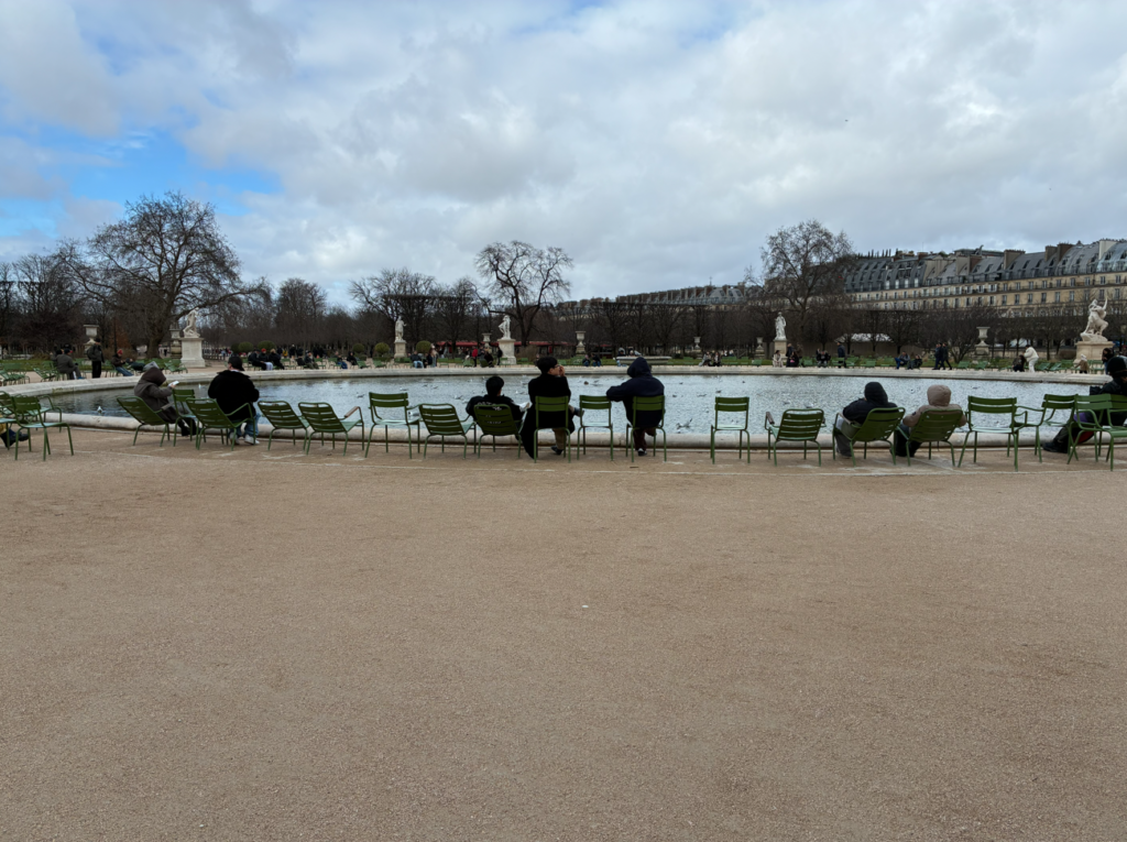チュイルリー庭園。2月なので緑は、ほとんど無いのですが、この庭園中央の噴水池の周りにはベンチが置かれており、観光客やパリ住民が自由に座って休憩、おしゃべり出来るようになってます。