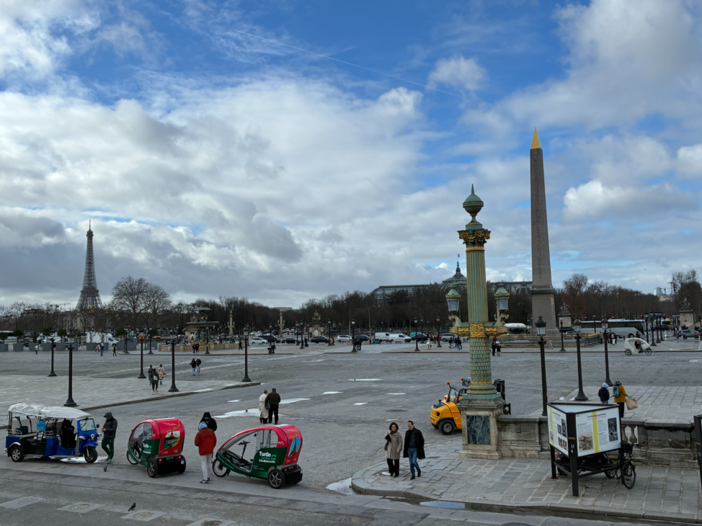 コンコルド広場。エジプトの柱ルクソール・オベリスク(Obélisque de Louxor)。本来はルクソール神殿に2本セットで存在していたのを、フランスが19世紀に1本もらってここに設置した物。遠くにエッフェル塔も見えててナイスショット。