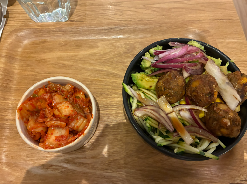 韓国人はおらず、アフリカ系の黒人店員だけでした。ヘルシーなサラダボール。キムチも辛すぎず、ヘルシーライスボールもグッド。