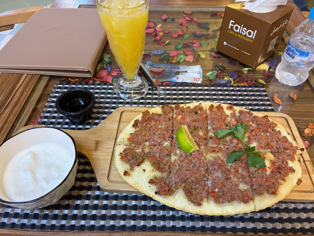 がっつり2万歩オーバー歩き回り、ペトラ遺跡を満喫したのでアンマンの街に戻りクリーニングした服を回収して、食事です。Faisal Cafe – Restaurant。Googleマップ☆4.8。お店お薦めのピッザ。うまーい。