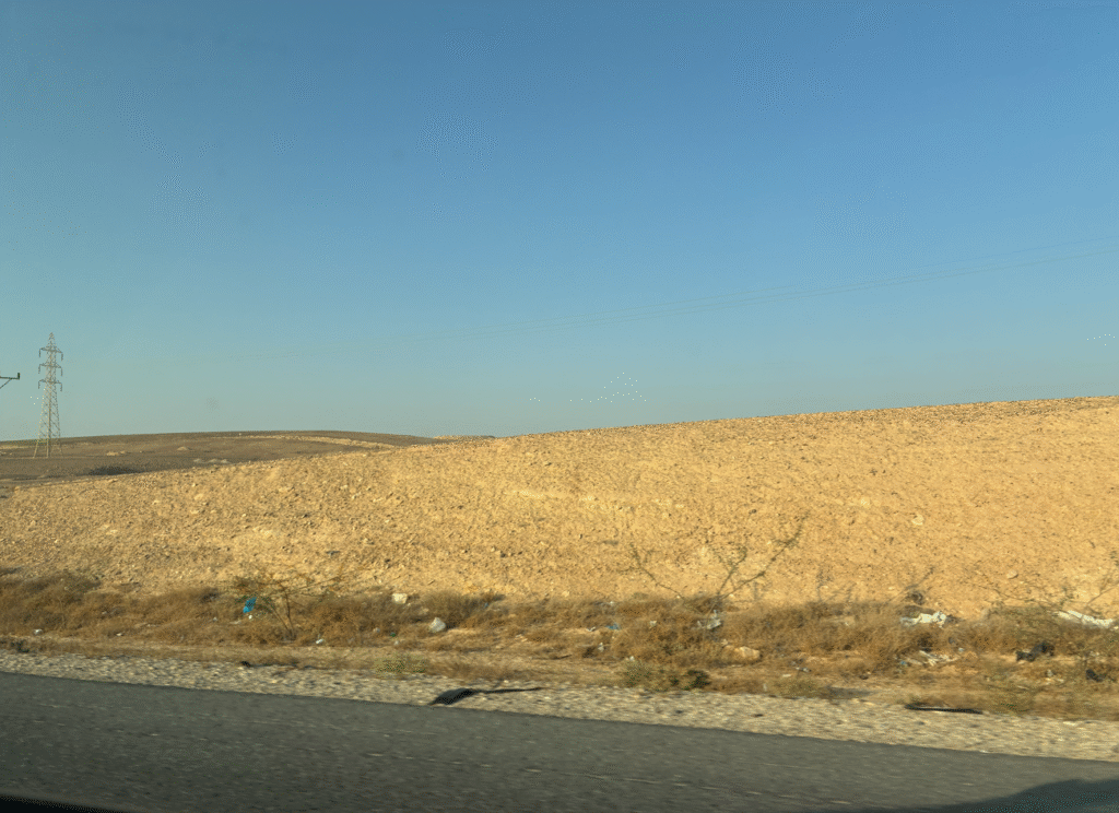 ペトラ遺跡はヨルダンの首都アンマン市街から車で3.5時間(約180km)くらいの場所にあります。道中の風景は、不毛な砂漠が延々と続いているので、あまり変わり映えはしない感じです。