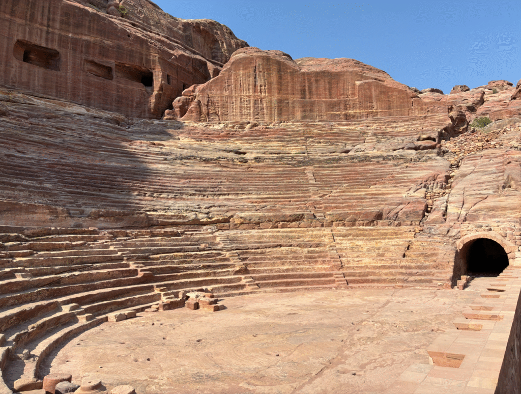 ペトラのローマ劇場(The Theatre)。ペトラ遺跡の中でも特に迫力のある構造物で、山肌を丸ごとくり抜いて造られた巨大な劇場。