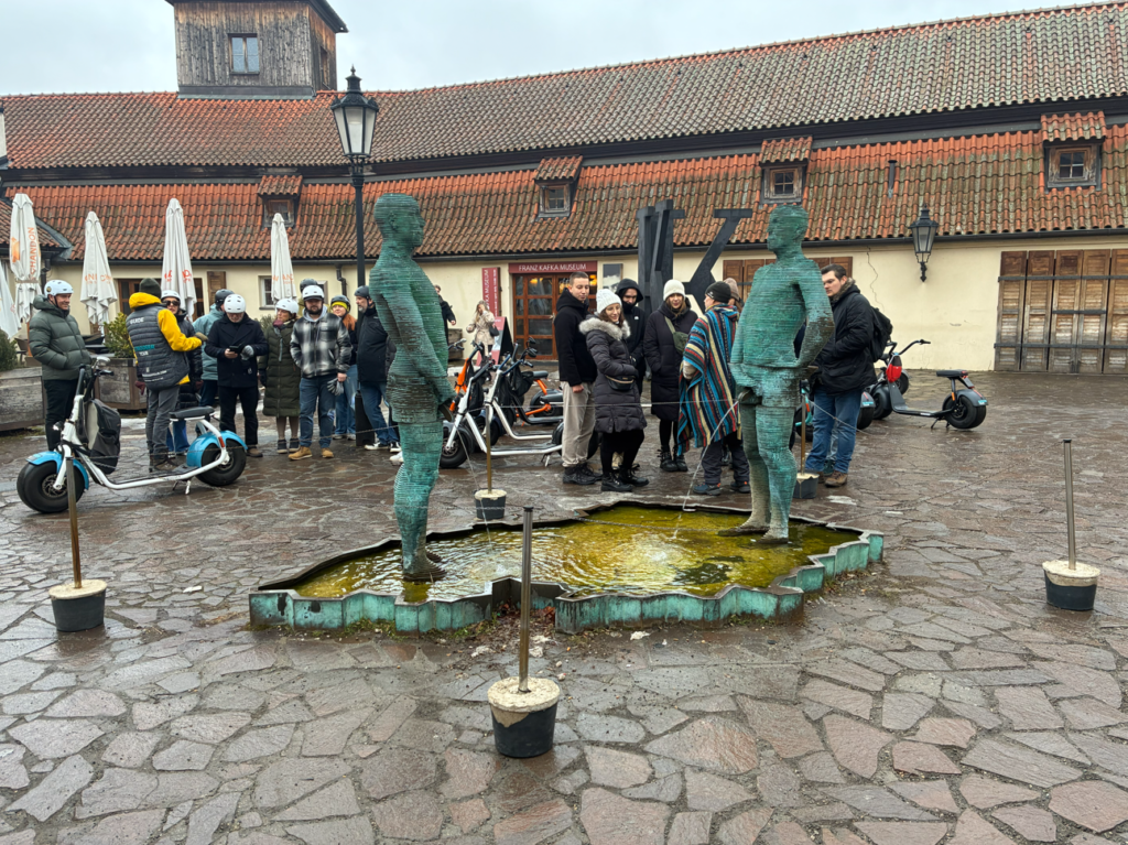 人が集まっていたので近づいてみると、しょんべん小僧ならぬ、Piss Sculpture。2人の男性像がチェコの国土型の水盤に放尿している政治風刺らしいです。後で調べて知りました。