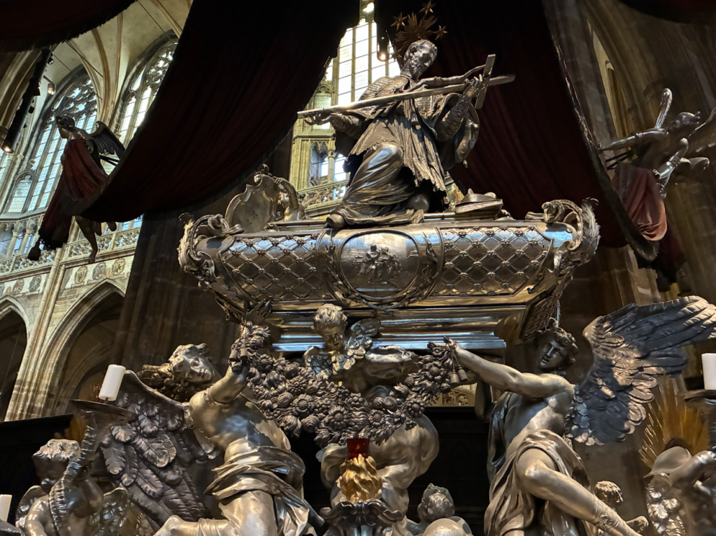聖ヤン・ネポムツキーの墓。純銀製(約2トン)。バロック彫刻の最高峰で、天使たちが棺を持ち上げる構図になっています。