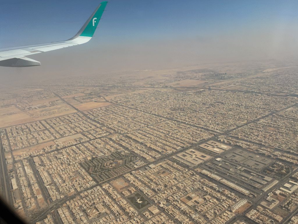 中東に入って以来、砂漠は多く見てきましたが、ここまで見事な砂漠の中の街ってのは初めての気がします。リヤド空港到着前の飛行機からの写真です。砂漠内に綺麗に区画して街を作っているように見えます。