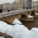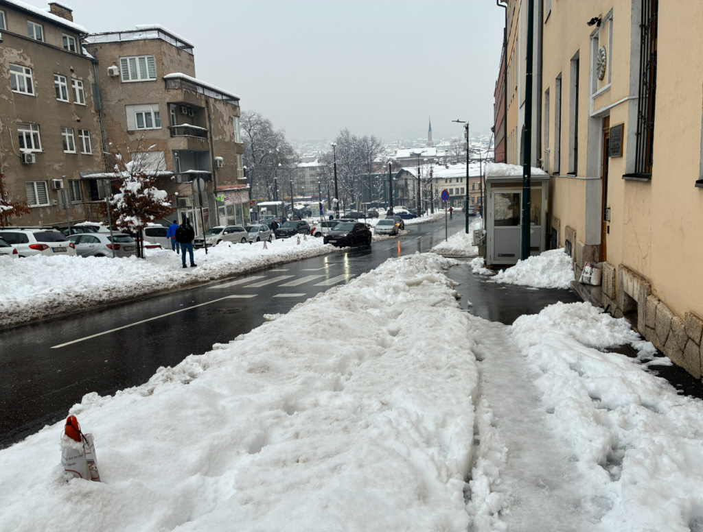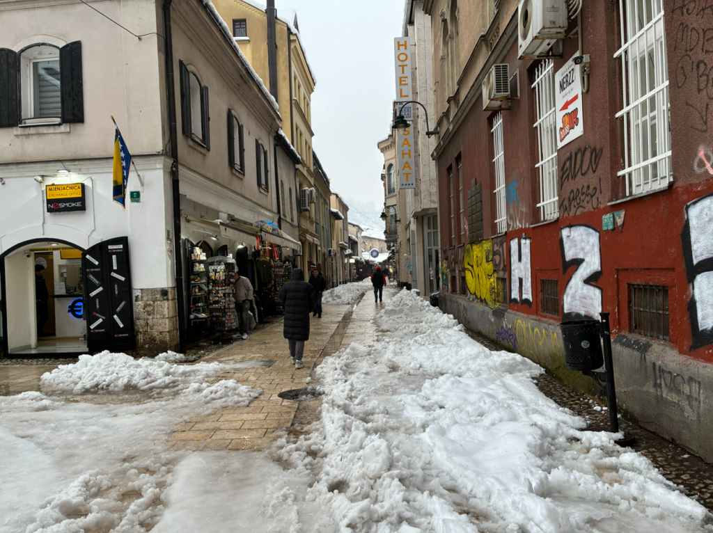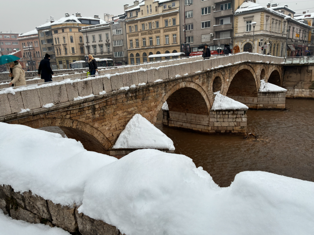 9:00にモスタルを出発して、11:35着だったので2時間半ほどの旅ですね。サラエボに近づくと雪がどんどん増えていきます。白山(石川)スキー場の道中みたい。
