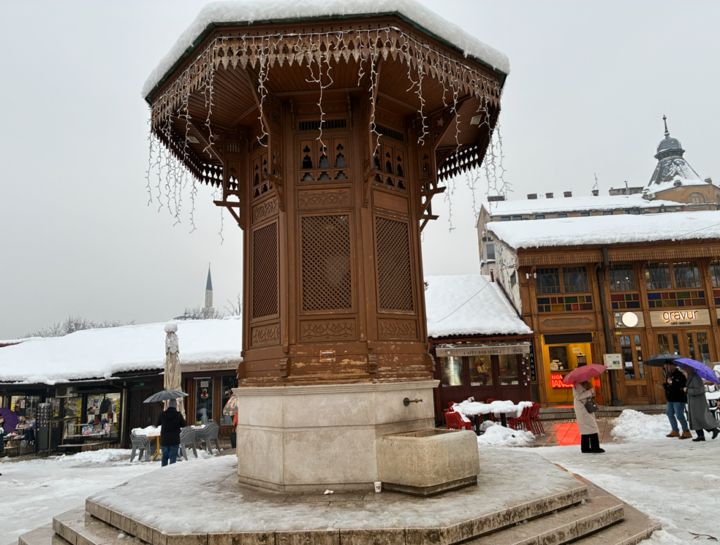 サラエボ旧市街の象徴的な木造の噴水セビリ(Sebilj Fountain)。渋谷のハチ公的な有名な待ち合わせスポットらしい。が、もともとは、オスマン帝国時代の公共給水所(セビル)