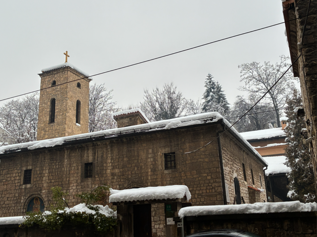セルビア正教会(Eastern Orthodox Church)。屋根の上の十字架と鐘楼(ベルタワー)が特徴で、イスラムのモスクでも、カトリック教会でもない。