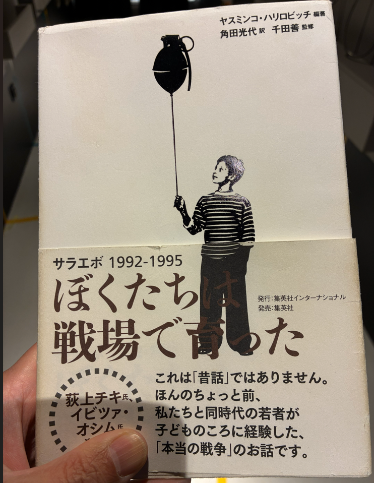 『ぼくたちは戦場で育った』原題:Growing Up Under Siege(著:ヤスミンコ・ハリロビッチ)。実際にサラエボ包囲を子どもとして生きた人たちの証言集の日本語版を貸してくれます。