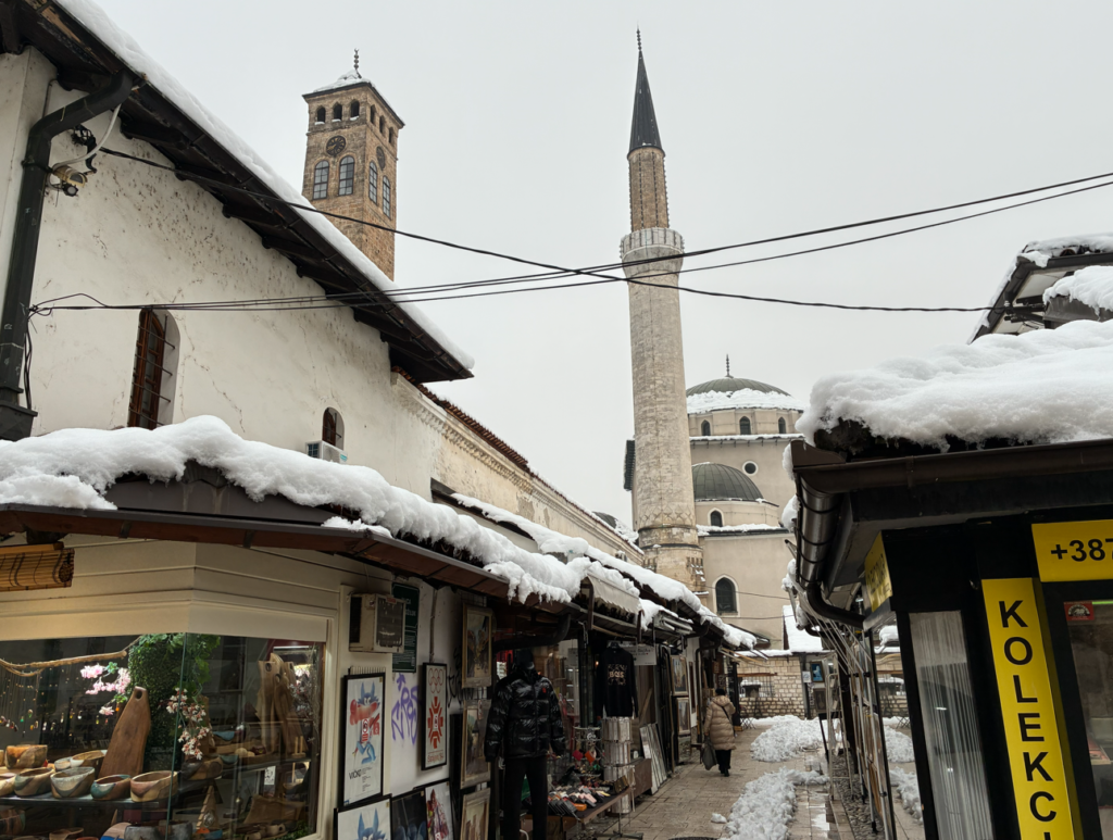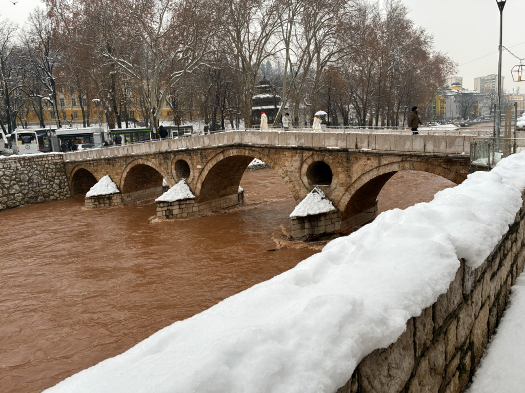 ボスニア4日目、昨日サラエボの旧市街を歩きましたが今日も街歩きしていきます。まずはラテン橋(Latin Bridge)を渡って旧市街に入っていきます。当然のごとく本日も雪だらけ。