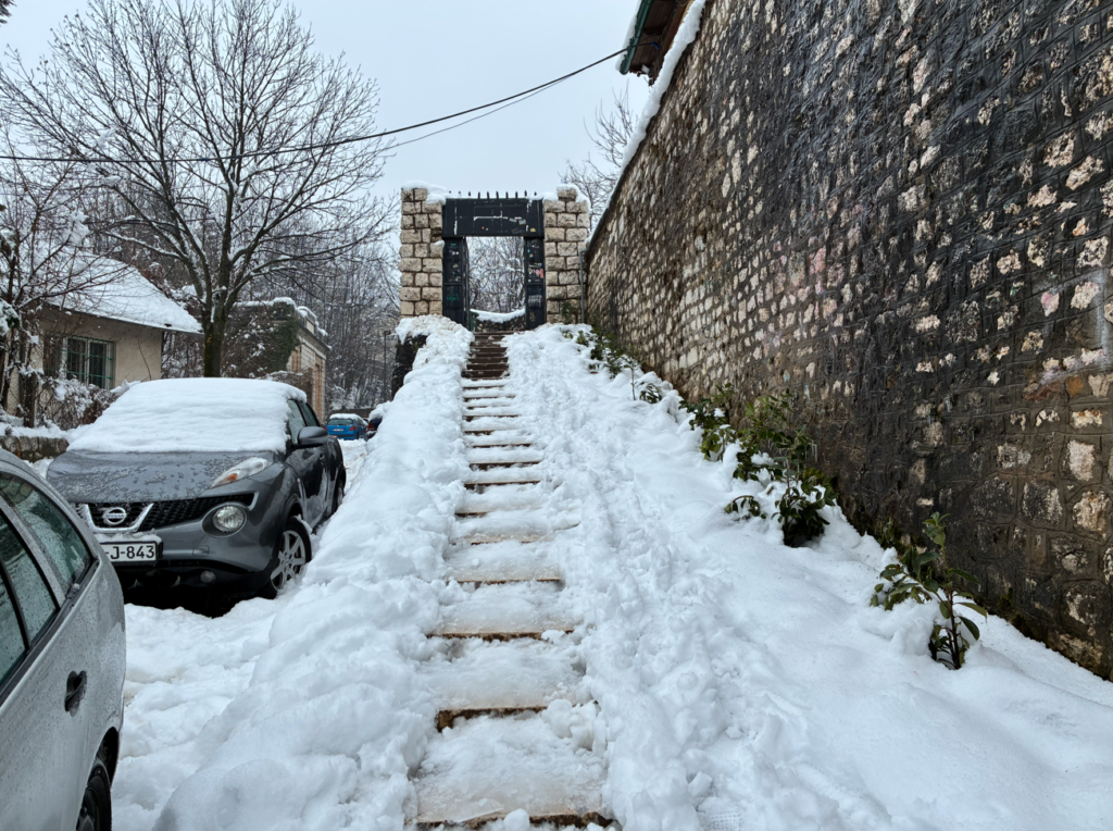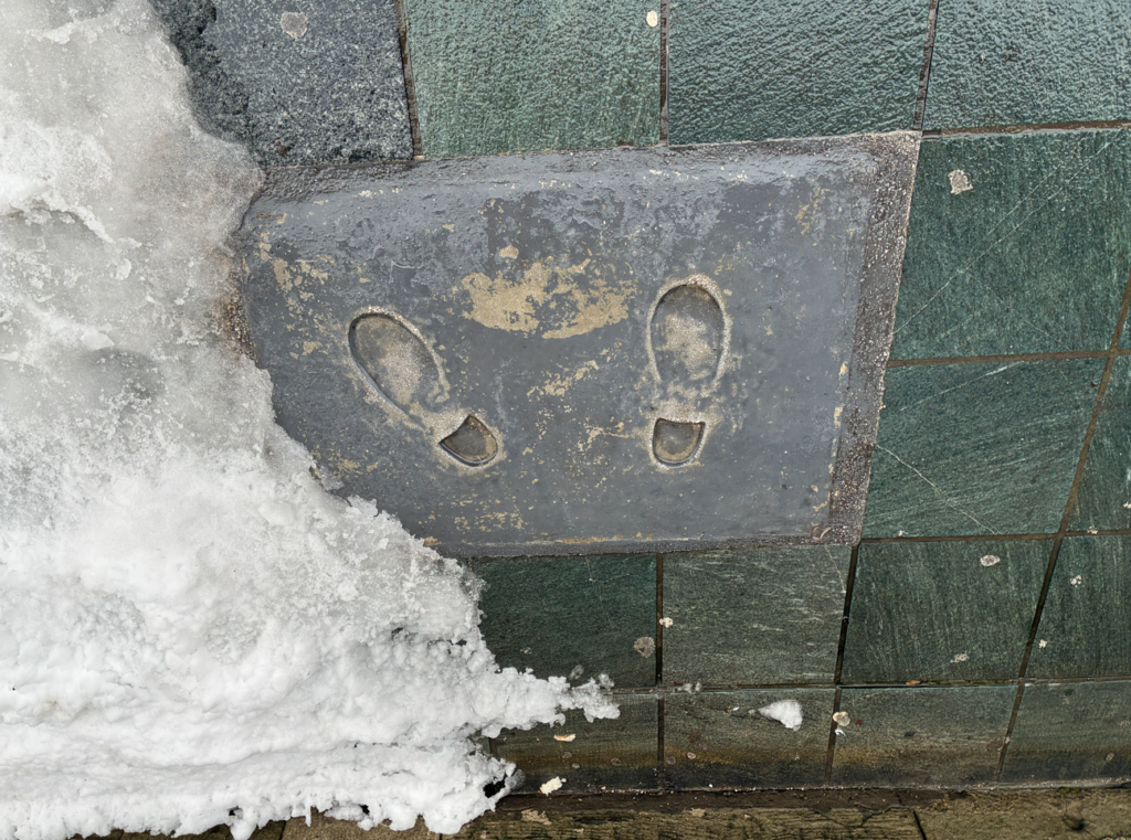 昨日よりは雨が弱く、雪も少ない。雪かき頑張ったんだろなぁ。石畳は見た目いいんだけど、雪とセットになると滑りやすくて怖い。