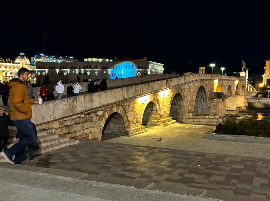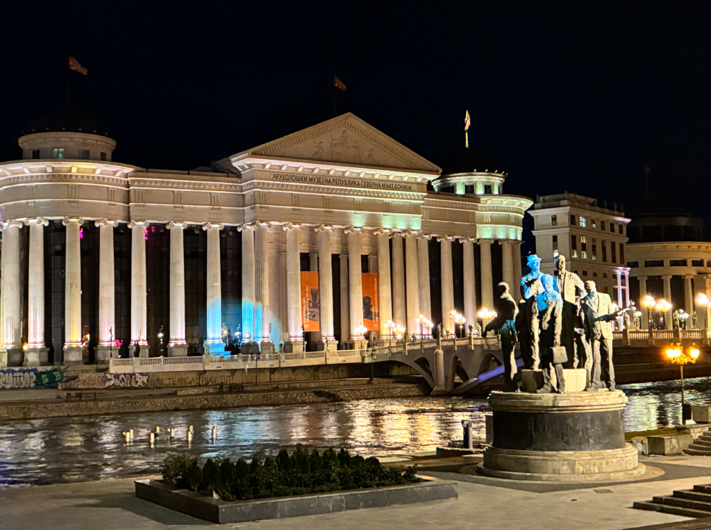 この橋から見える光景がお洒落。北マケドニア考古学博物館らしいが、古代ローマ風。