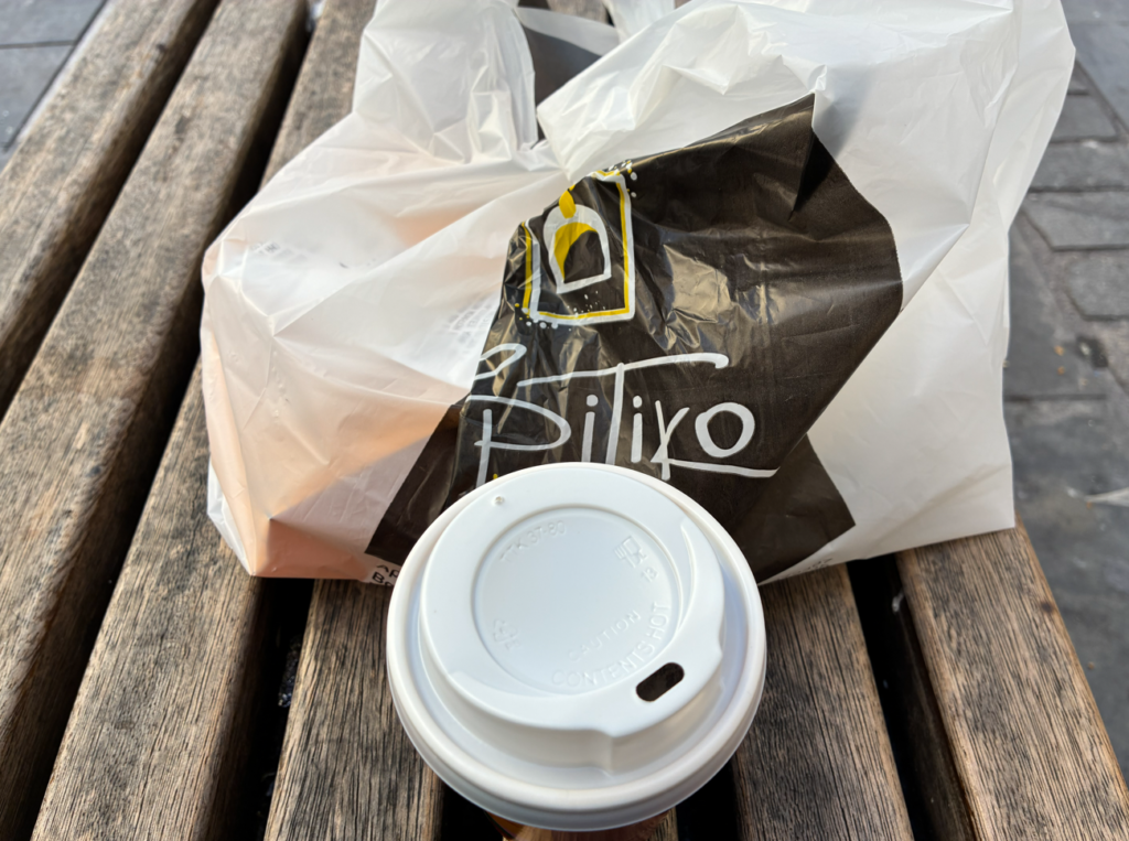 まだ時間あるので街のみんなの真似して、人気っぽいベーカリーでピザとコーヒーをテイクアウト。街を歩きながら食べることに挑戦するも、どうも落ち着かない(笑)。やはりベンチで腰掛けてゆっくり食事。歩きながらパンを食べたりコーヒー飲んでる人率が昼時は特に高い。ヨーロッパだね。