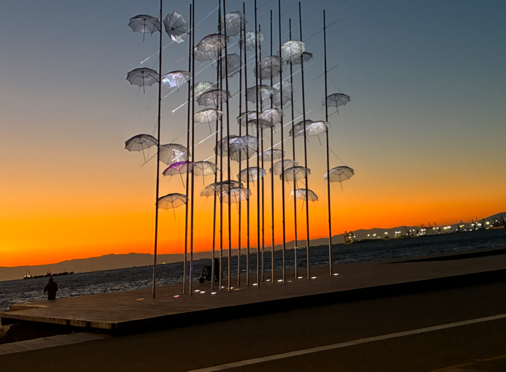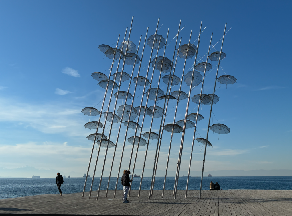 バス出発の時間まで、まだ余裕があるので海沿いを歩いてみるとゾンゴプロスの傘。テッサロニキ海沿いプロムナードにあるモニュメント。