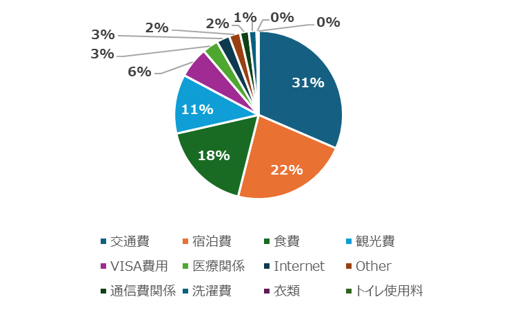 想定通りですが、交通費31%、宿泊費22%、食費18%の3つが3大費用で、この3つで全体の71%を占めます。