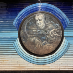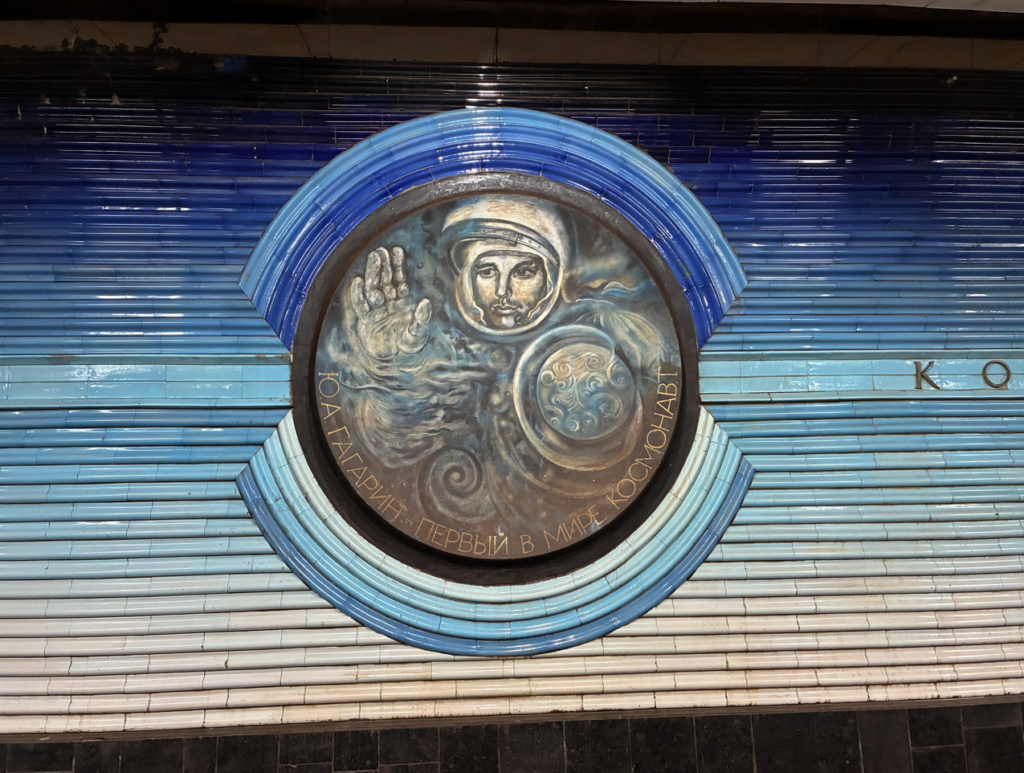 駅構内は深いブルーを基調とした壁面と照明で統一され、プラットフォームの壁には、ソ連および中央アジア出身の宇宙飛行士たちを描いたレリーフ(メダリオン)が並びます。宇宙開発をテーマにした地下宮殿。