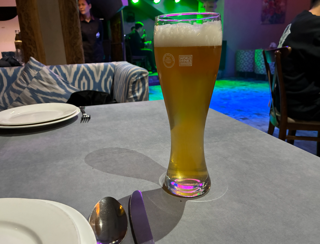 SARBAST(サルバスト)ビール。ウズベキスタン国内でよく見かけるローカルビールブランド。ライト寄りのラガーで、プロフやケバブの油を流す役割としてちょうどいい。