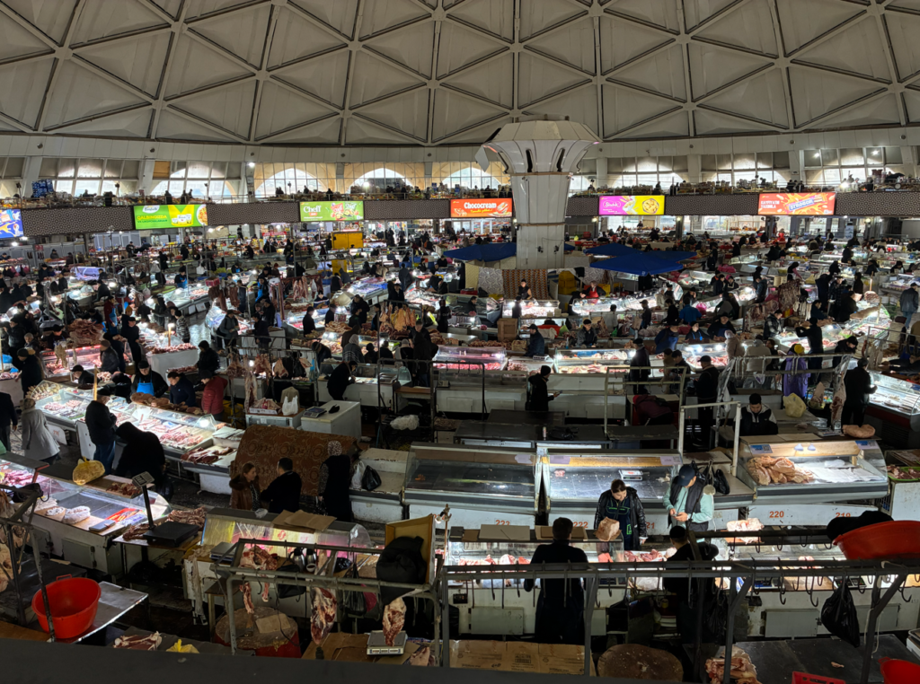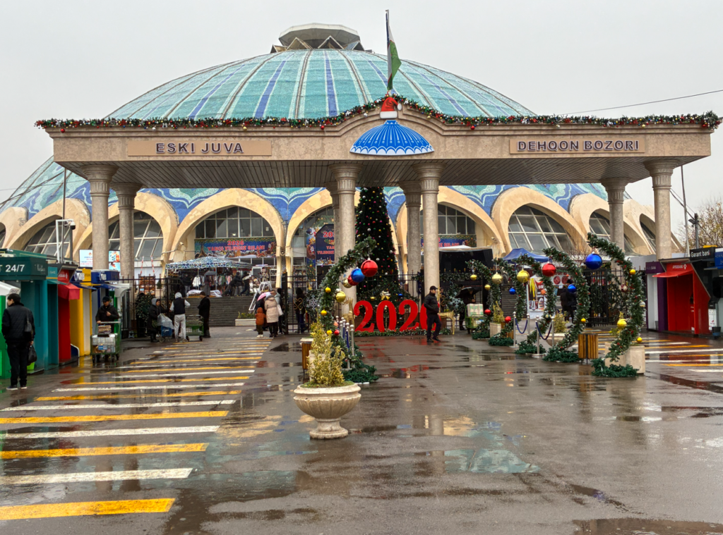 お次はタシケント旧市街に位置する、中央アジア最大級の伝統市場であるチョルスー・バザール(Chorsu Bazaar)。巨大な青いドーム屋根がお洒落。