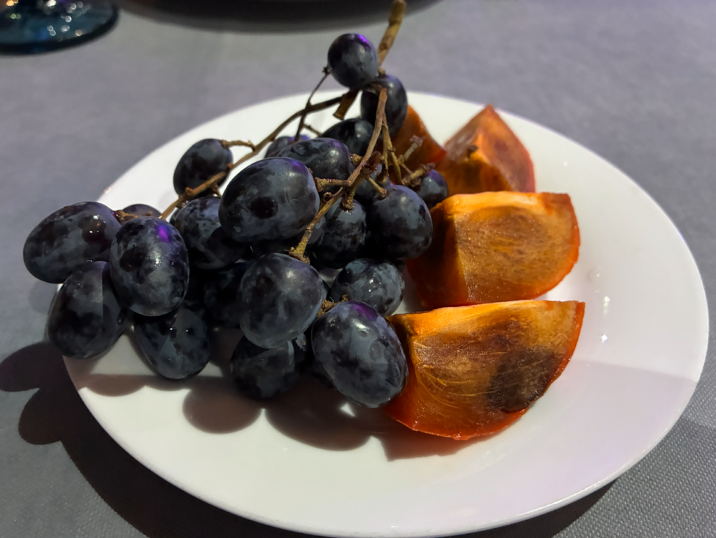 食後にはサービスのフルーツ。ぶどう(黒ぶどう)&柿(kaki)。口がサッパリ。