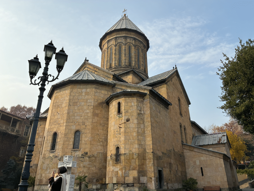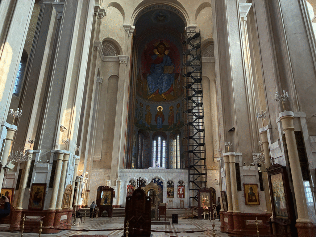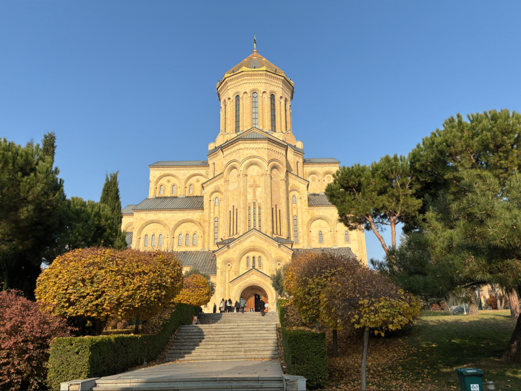 至聖三者大聖堂(Holy Trinity Cathedral / Sameba)。トビリシ最大の教会&ジョージア正教の象徴。外観は巨大で圧倒的。トビリシ中心部にいると、丘の上に金色のドームが見えるのがサメバ。
