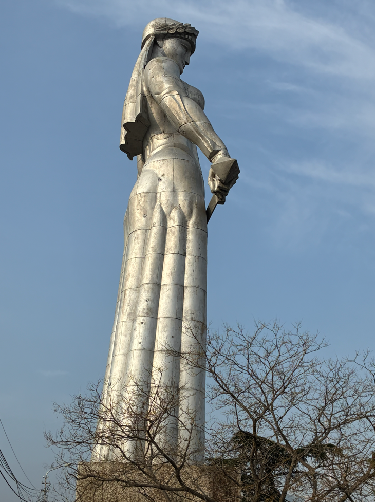 ジョージア民族の象徴となる巨大な女性像Mother of Georgiaの銅像。ジョージアは長い歴史の中で何度も侵略や戦争を経験しており、その“誇りと強さ”を象徴するために建てられた像。剣を持っています。