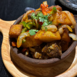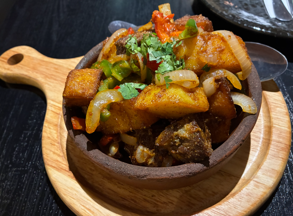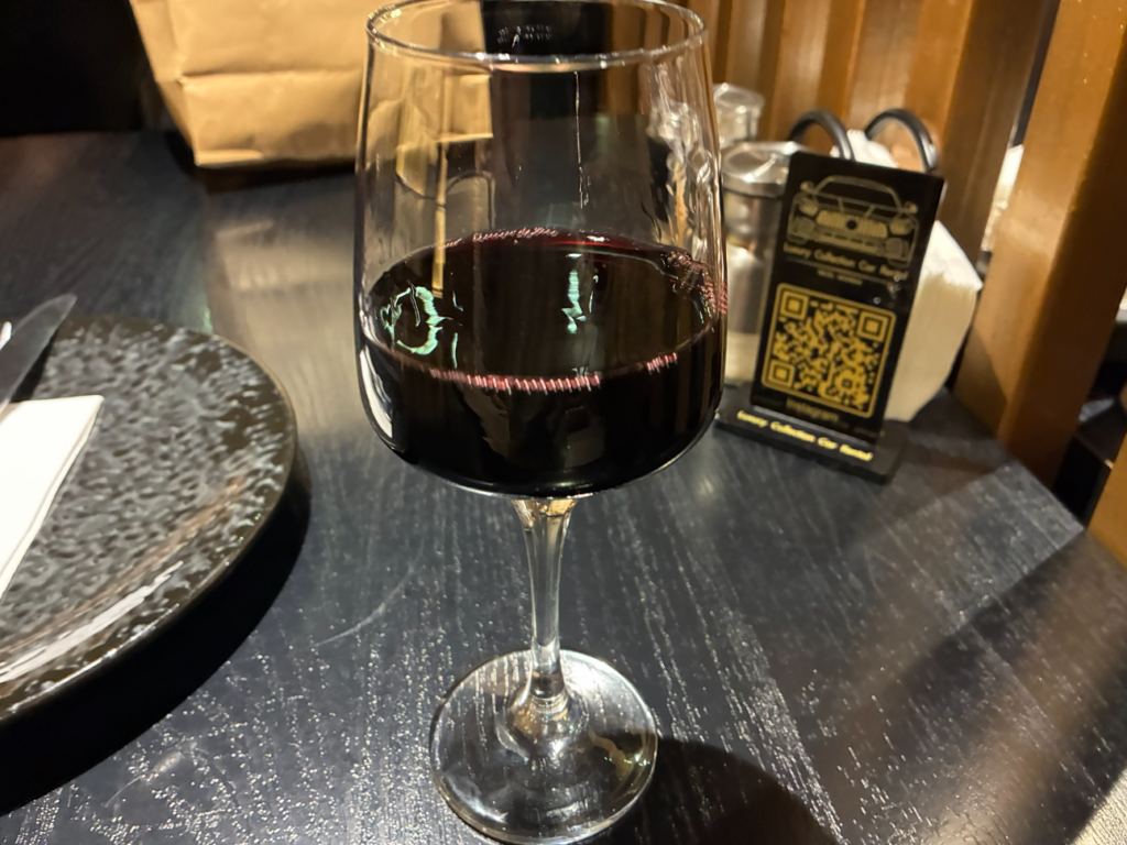 ジョージアらしく赤ワイン&オジャフリ(OJAKHURI)。オジャフリは、“ジョージア版・肉じゃが炒め”。肉+ジャガイモ+玉ねぎの鉄板料理。