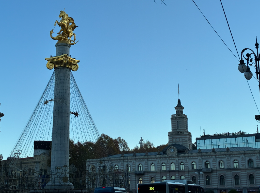 お買い物の帰り道リバティ・スクエア(Liberty Square)。以前に訪れた時と反対方向から歩くと、自由広場のセント・ジョージ像(St. George Statue)、トビリシ市庁舎(City Hall)、Mother of Georgia(Kartlis Deda)が直線状に見えるスポットを新発見。以前にも訪れた場所ですが、新発見が嬉しい。いい写真。