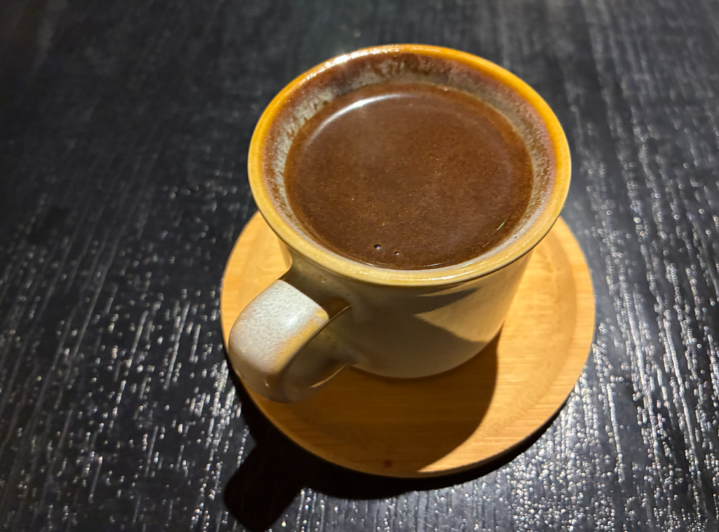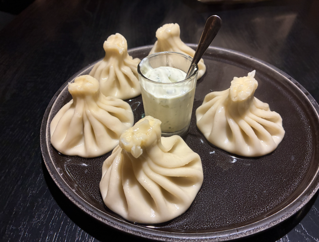 ヒンカリ(Khinkali)&ターキッシュコーヒー。今回はヒンカリの正しい食べ方(ジョージア流)で食べます。① ツマミ(頭の部分)を指でつまむ、② かぶりつく前に少し穴を開ける、③ 中のスープをまず飲む、④ スープを飲み切ったら具と皮を食べる、※上の“ねじれ頭部分”は皿に残すのが“ジョージア式”。