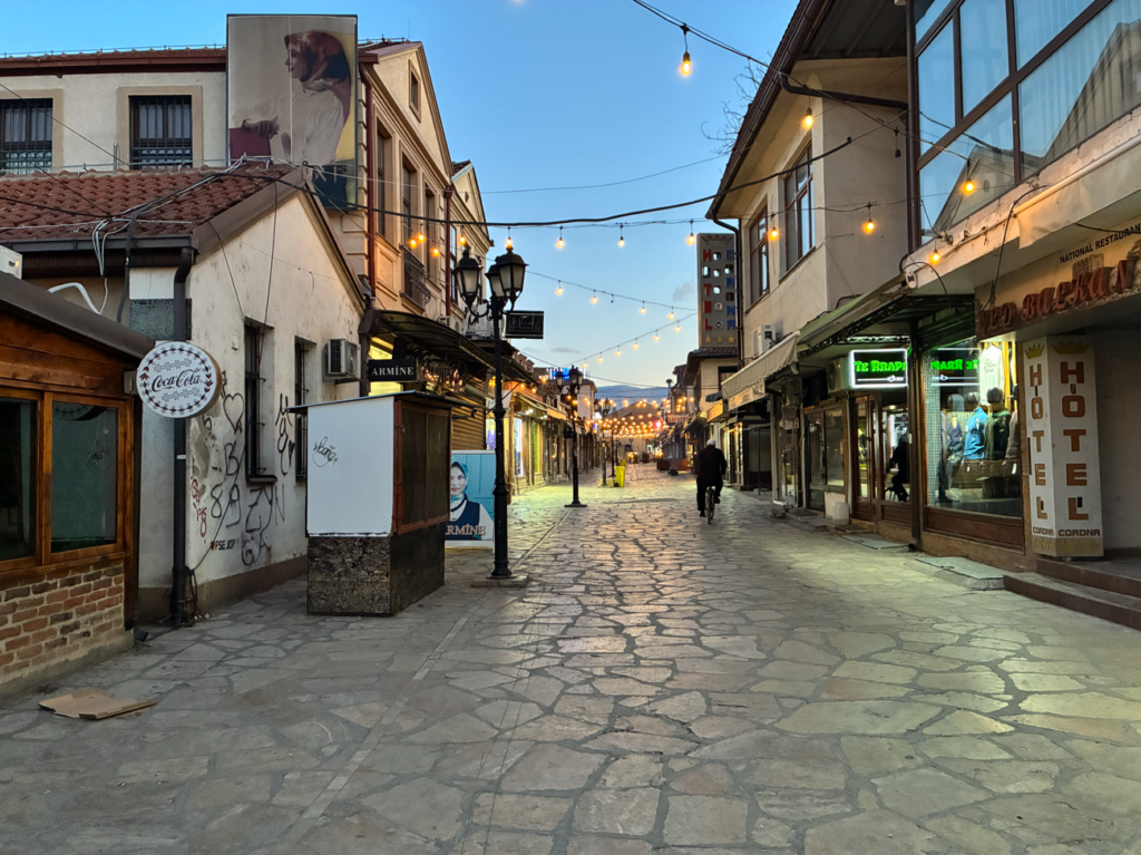 昨日は深夜時間だったため外したオールドバザール(Old Bazaar Skopje)。まだ開店前の準備中ですが、路地の骨格/朝の生活感が見て取れます。