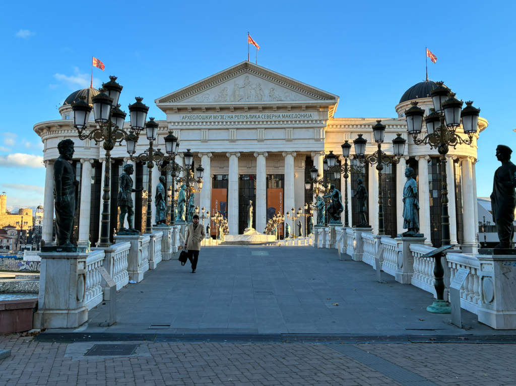 別方向を向けば北マケドニア考古学博物館(Archaeological Museum of North Macedonia)。まさに古代ローマ。たしかに、やり過ぎで賛否の意見が割れるというのも分かる気がします。