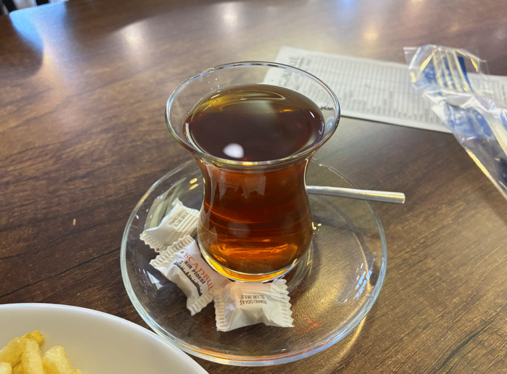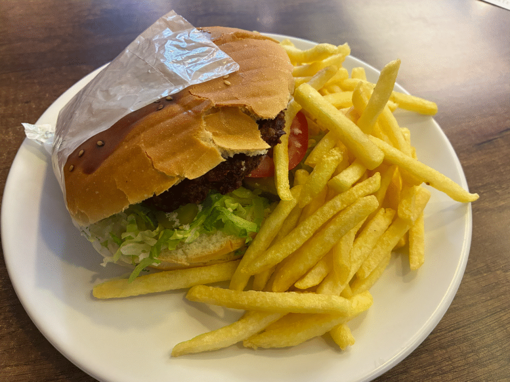 ブランチでハンバーガー。Sebnem Cafe。Googleマップ☆4.3。もちろんトルコでもハンバーガーを食べます。THE・ビーフ感が強く、アメリカンバーガー風で美味い。チャイと合います。