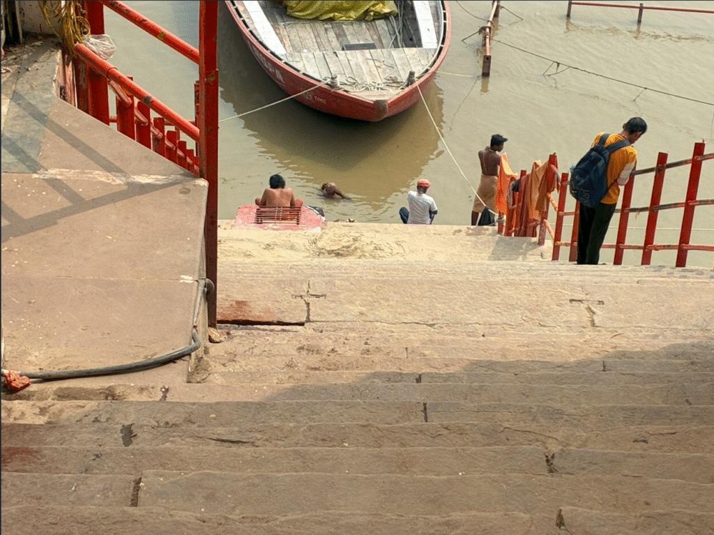 昨日、ボートでガンジス川から見たガート(石段・階段状の河岸)へ歩いて行ってみます。かなり細く小さいガートですが、沐浴している人がいます。早朝だけかと思ってましたが、昼でも沐浴するっぽいです。