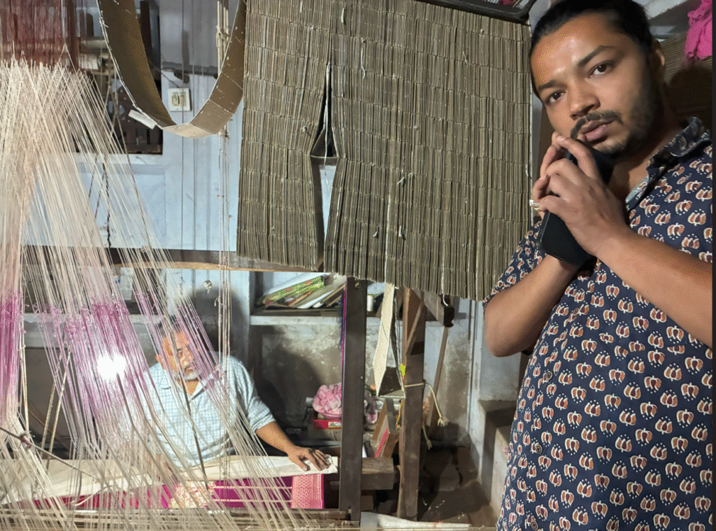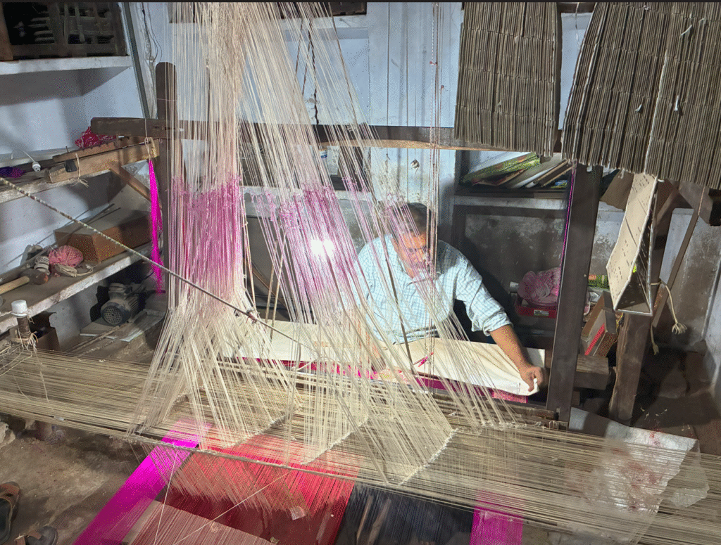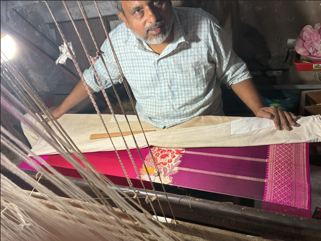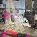 インドでもっとも有名な織物のひとつ「バナーラシ・シルク(Banarasi Silk)」を織る工房で、細かい糸を丁寧に編み込んでいく作業はまさに職人技。